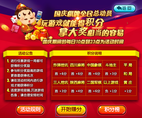 1、活動(dòng)期間進(jìn)入棋牌世界進(jìn)行游戲,每完成一局游戲則可獲得相應(yīng)活動(dòng)積分。